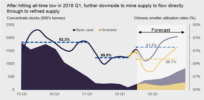 Our base case sees smelter utilization rates improving from 2018 H2 through the end of 2019 as robust mine supply growth from the rest of the world and modest (3.8 percent in 2018 and 4.7 percent in 2019) growth from China supports rising concentrate availability. In this article, we stress test the global concentrate (and metal) market against a scenario of falling Chinese mine supply over the next 18 months. In effect, we identify the required shortfall of Chinese (or indeed ex-China) mine supply to affect genuine tightness in global metal markets. While we consider this scenario unlikely, such an outcome (all else being equal) would drive further metal deficits through 2019 as smelter utilization rates in China would remain below 90 percent. Such a scenario would see metal stocks fall to levels not seen since the 06/07 price spike.