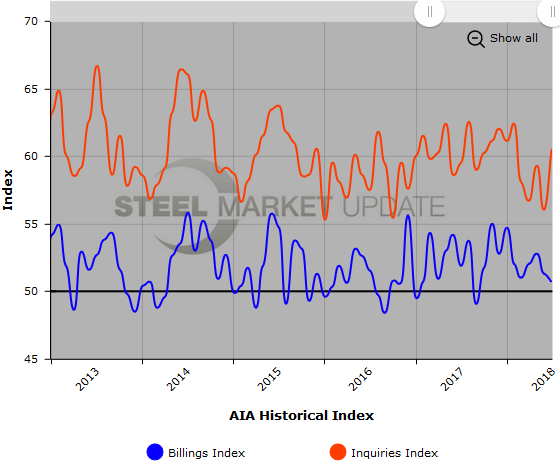 Below is a graph showing the history of the AIA Architecture Billings Index and Inquiries Index. You will need to view the graph on our website to use its interactive features; you can do so by clicking here. If you need assistance logging into or navigating the website, please contact Brett at 706-216-2140 or Brett@SteelMarketUpdate.com.