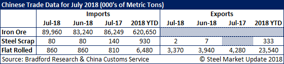Chinese Iron Ore, Scrap, Flat Rolled Data through July