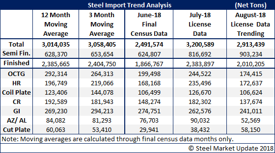 Earlier this week, the U.S. Department of Commerce released the latest license data on foreign steel for the months of July and August. As SMU reported last week, the August trend has been for imports to be at, or above, 3 million net tons. This week the trend suggests August will be closer to 2.9 million net tons.