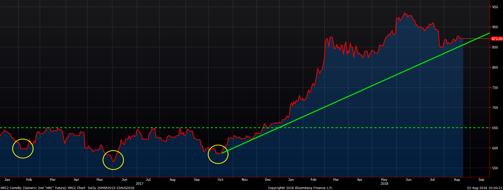 A favorite pasttime in the steel industry is to have long discussions about price directions, confirming opinions rooted in market participants’ “guts.” I prefer to look at hard data. Below is the chart used late last year pointing out the reverse head and shoulders and the $650 ceiling breakthrough. I have drawn a simple trendline from the low of October. The chart has held above this trendline with the recent correction finding support at the uptrend line. The first high made in March ($875) was followed by a higher high made in June ($935). The low point made in late July ($848) was higher than the low point made in late April ($831). Higher highs and higher lows are healthy signs of a rally, according to Dow theory. So, the rally continues, but we now have a line in the sand to watch. If futures trade below this line, we can shift into a more defensive mode. In the meantime, I’ll keep trading what has been working all year.