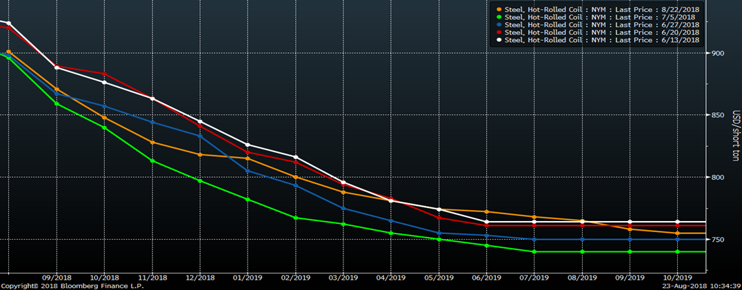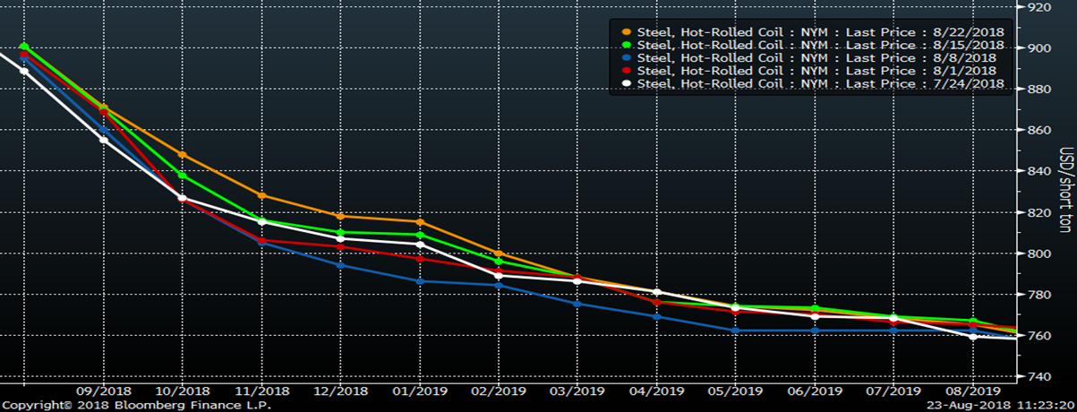 Below is a chart of the CME Midwest HRC futures curve. The white line was from the June, 13th settlement, the green line the July 5th settlement and the orange line from August 22nd. The first takeaway from this chart is that not much has really happened in the past two months. Prices have remained rangebound.