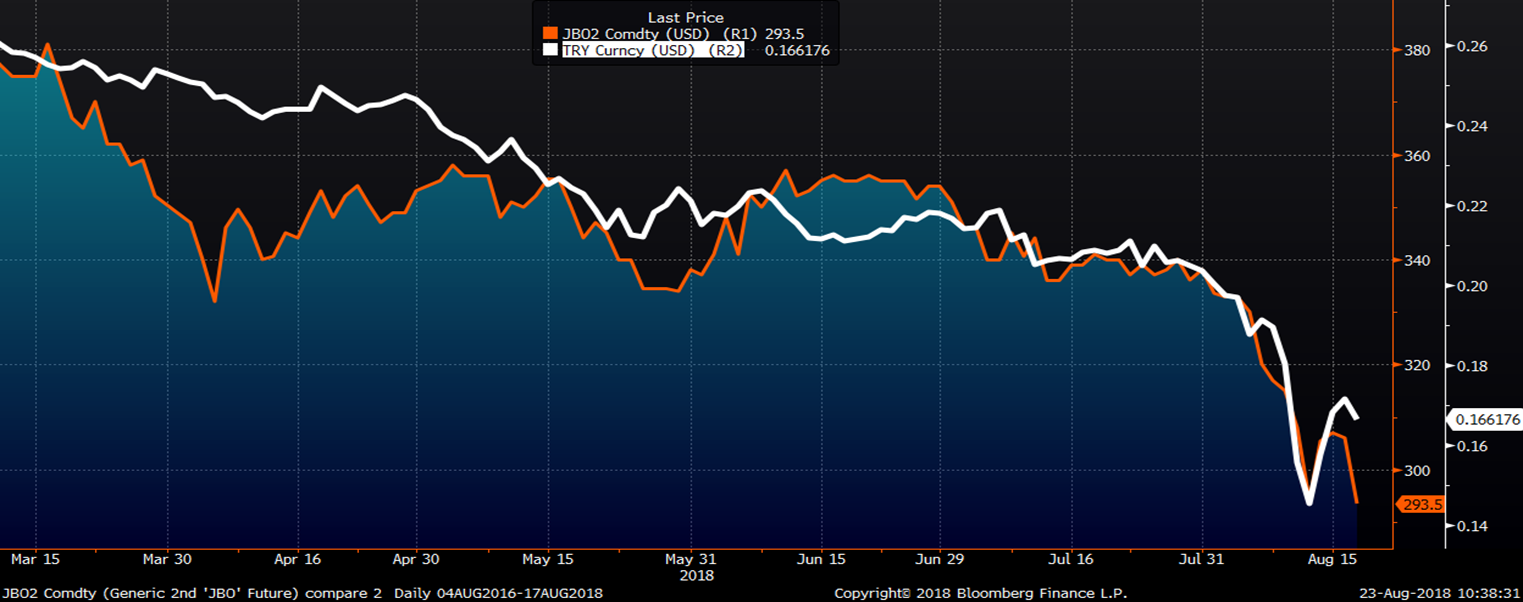 Turkish scrap has dropped sharply as Turkey’s financial markets and currency plummeted. The 2nd month LME Turkish scrap future has fallen from $340 to $293.50/t in August.