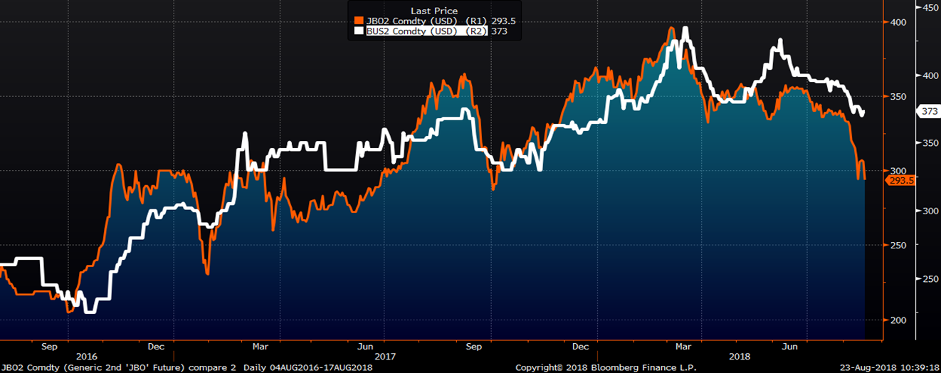 The chart below looks at the last five weeks. The administration’s announcement to increase the Turkish steel tariff to 50 percent was on August 10th. The blue line was the curve on August 8th. You can see that prices have moved higher since then with last night’s close at the highest level.