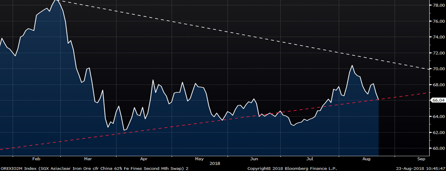 September SGX iron ore futures broke back below the long-term uptrend line we’ve been following after failing to rally above $70 in mid-August.