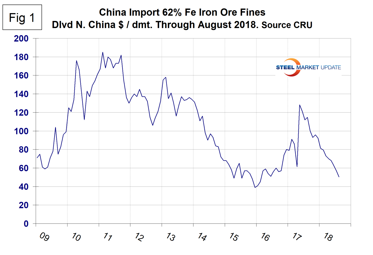 The weekly average spot price of 62% fines delivered North China was $50.30 per dry metric ton in mid-August. In one month, the price declined by 11.6 percent and is down by 56.1 percent year over year. The price has declined by 61 percent from its recent peak in May last year.
