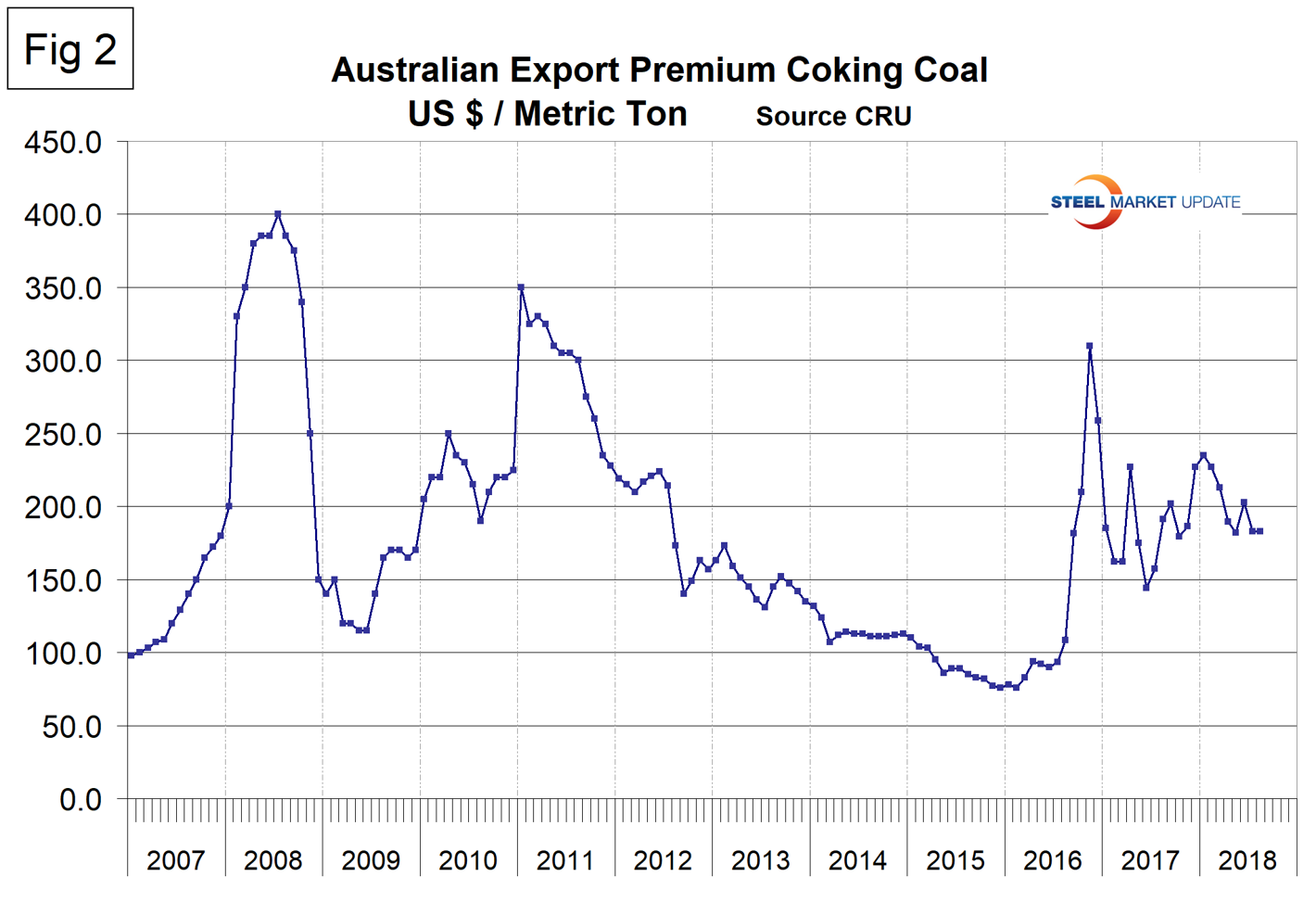 Coking coal prices have been erratic in the last two years. From February 2016 to November 2016, the price of premium low volatile coking coal more than quadrupled from $76 to $310 per metric ton. Since then, the price has stabilized in the $200 range and in August stood at $183. (Figure 2).
