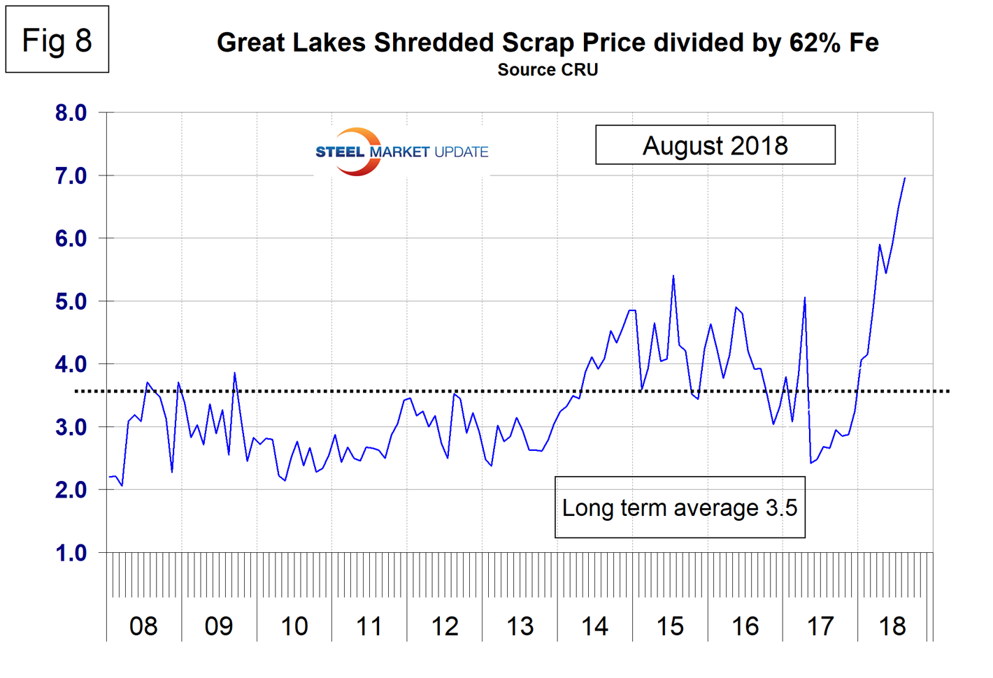 There is a long-term relationship between the prices of iron ore and scrap. Figure 7 shows the prices of 62% iron ore fines delivered N. China and the price of shredded scrap in the Great Lakes region through early August 2018. The correlation since January 2006 has been 80.7 percent. There has been a very unusual divergence in these prices in 2018.