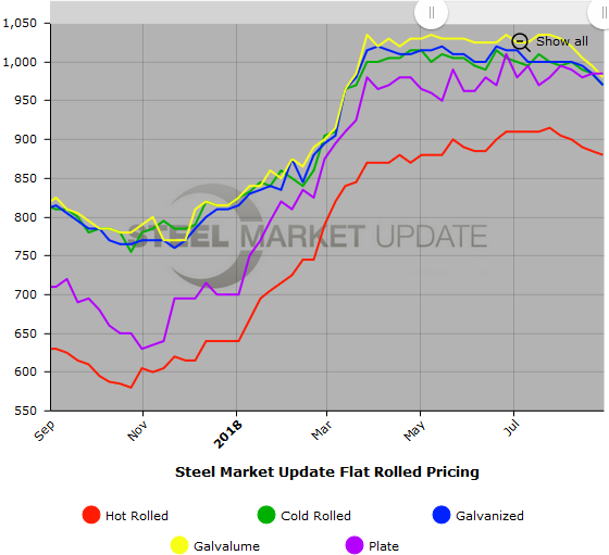 SMU Note: Below is a graphic showing our hot rolled, cold rolled, galvanized, Galvalume and plate price history. This data is available here on our website with our interactive pricing tool. Note that plate prices are not yet available on our website, but we are in the process of adding that dataset. If you need help navigating the website or need to know your login information, contact us at info@SteelMarketUpdate.com or 800-432-3475.