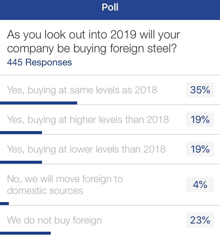 So far, the 25 percent tariff has reduced steel imports by a reported 24 percent, suggesting that domestic mills can expect less competition from foreign producers. Surprisingly, only 4 percent of the respondents said they will be moving foreign orders to domestic mills. Thirty-five percent said they will be buying foreign material at the same level in 2019, while another 19 percent said they will be sourcing even more foreign next year. Only 19 percent said they anticipate buying less foreign steel in 2019. These figures suggest the majority of steel buyers believe domestic prices will remain so high next year that foreign offers, including the tariff, will still be worth considering. (The remaining 23 percent are not purchasers of foreign steel.)