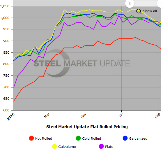 SMU Note: Below is a graphic showing our hot rolled, cold rolled, galvanized, Galvalume and plate price history. This data is available here on our website with our interactive pricing tool. Note that plate prices are not yet available on our website, but we are in the process of adding that dataset. If you need help navigating the website or need to know your login information, contact us at info@SteelMarketUpdate.com or 800-432-3475.