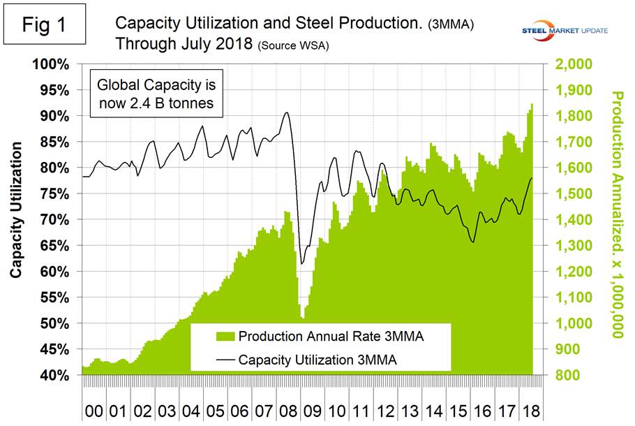 Global steel production in July hit an annual rate of 1.855 billion metric tons. Capacity is calculated to be 2.38 billion metric tons; therefore, capacity utilization was 78 percent, according to the latest Steel Market Update analysis of World Steel Association data.
