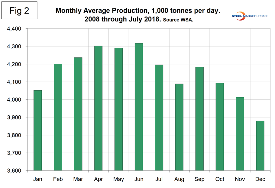 As we dig deeper, we start with seasonality. On average, global production on a tons-per-day basis peaked in the early summer in the years 2010 through 2016, but last year the second half downtrend was delayed until November. Figure 2 shows the average tons per day of production for each month since 2008. In those 11 years on average, July has been down by 2.8 percent; this year July was down by 1.7 percent. Note: July had one extra day over June, which is why tons per day were down as total monthly production was up.