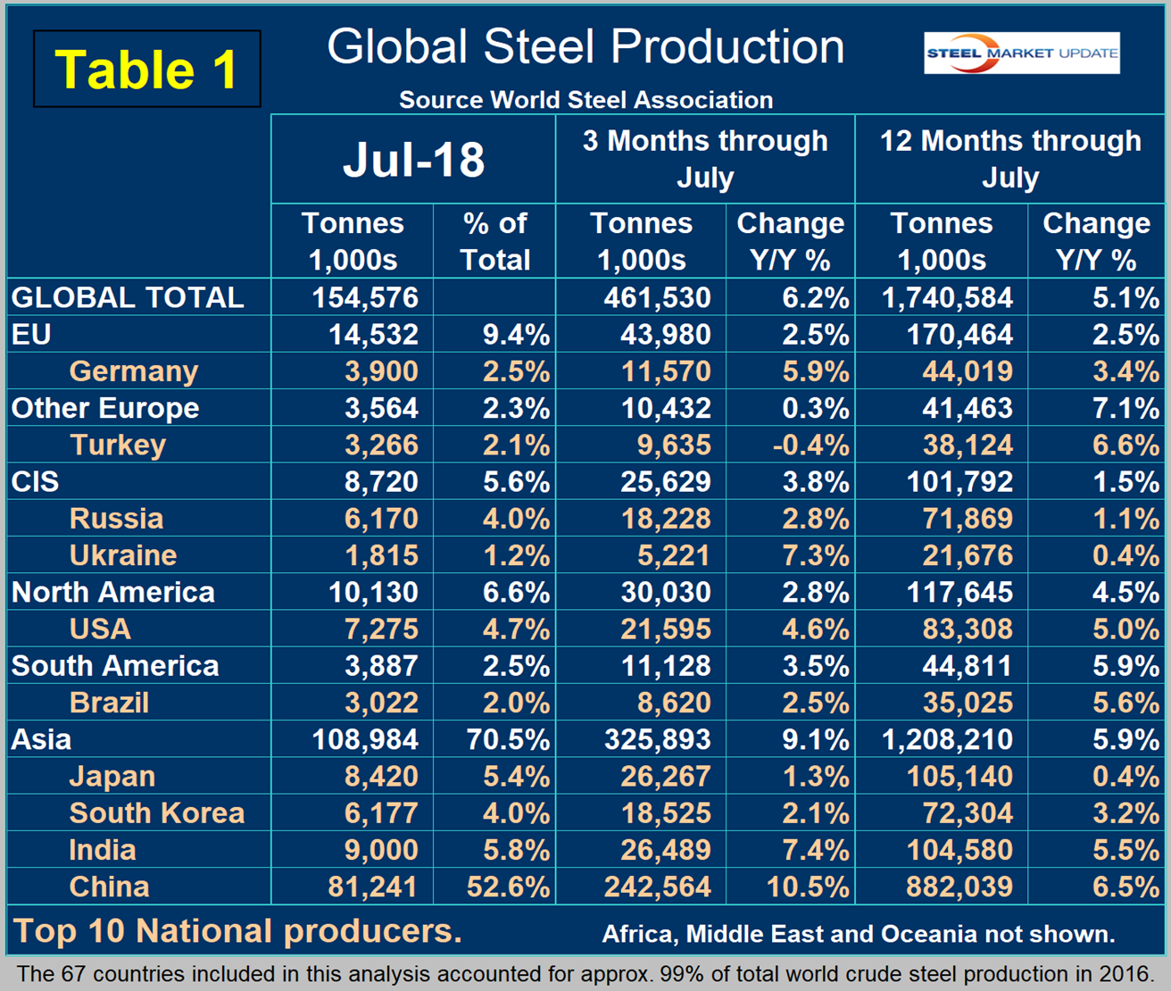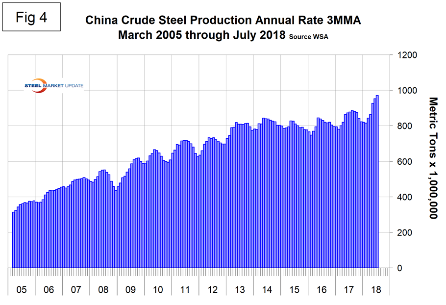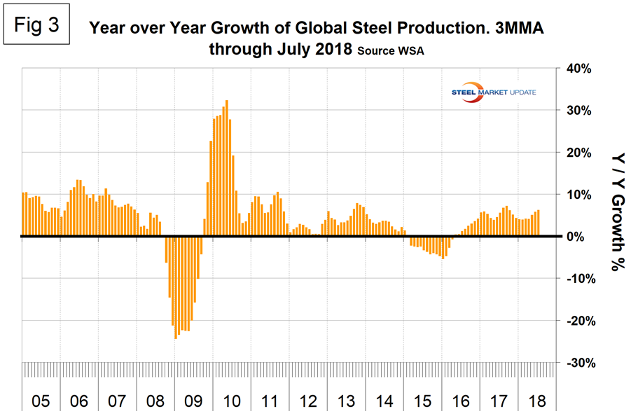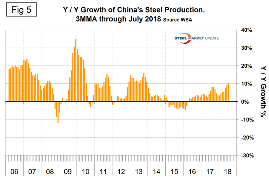 In three months through July, Chinese production grew by 10.5 percent year over year as the rest of the world grew by 2.3 percent. In 2018, China has increased its share of global steel production, which in June hit an all-time high of 52.7 percent, declining slightly in July to 52.6 percent.