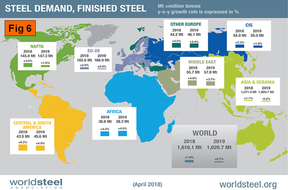 The April WSA Short Range Outlook (SRO) for apparent steel consumption in 2018 and 2019 is shown by region in Figure 6. WSA forecasts global steel demand will reach 1,616.1 Mt in 2018, an increase of 1.8 percent over 2017. In 2019, it is forecast that global steel demand will grow by 0.7 percent to reach 1,626.7 Mt. T.V. Narendran, chairman of the WSA economics committee, commented: “In the next couple of years the global economic situation is expected to remain favorable with high confidence and strengthening recovery of investment levels in advanced economies. Benefitting from this, steel demand in both developed and developing economies is expected to show sustained growth momentum with risks relatively limited. However, possible adverse impact from rising trade tensions and the probable U.S. and EU interest rate movements could erode this current momentum. The outlook for steel demand in the U.S. remains robust on the back of the strong economic fundamentals – strong consumption and investment due to high confidence, rising income and low interest rates. The manufacturing sector is being supported by a low dollar and increasing investment, while rising housing prices and steady non-residential sector growth point to a healthy construction sector. Though the recent tax reform is further expected to boost steel demand through its positive impact on investment, there is some concern over a possible overheating of the economy. The announced infrastructure plan is unlikely to affect steel demand in the short term.”