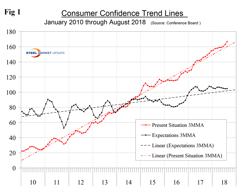 All three measures are higher than they were at the pre-recession peak of 2007. Expectations have been relatively constant for over a year, but the consumer’s view of the present situation has been surging since December 2010. Comparing August 2018 with August 2017, the 3MMA of the present situation was up by 20.8 and expectations were up by 3.2 points (Table 1).