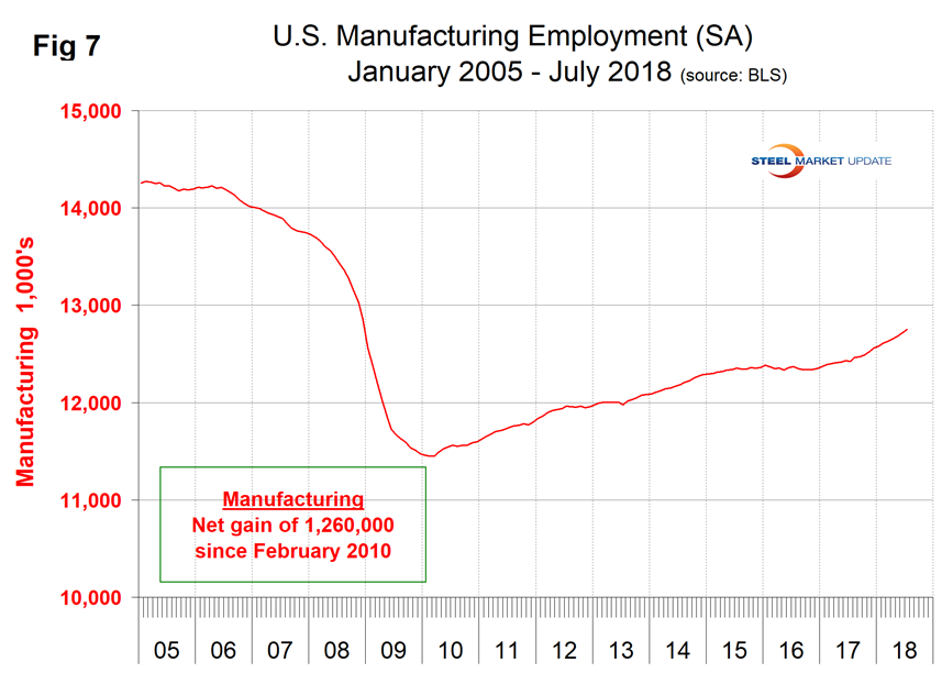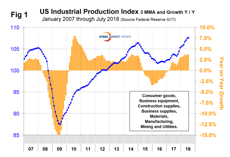 Figure 1 shows the IP index since January 2007 with the year-over-year growth. The three-month moving average (3MMA) of the year/year growth is shown by the brown bars in Figure 1. March 2017 was the first month of positive growth in the 3MMA since April 2015. Growth has been consistently in the mid 3 percent range in the five months through July 2018. Manufacturing capacity utilization improved from 74.48 percent in January last year to 75.60 in July 2018, also on a 3MMA basis.