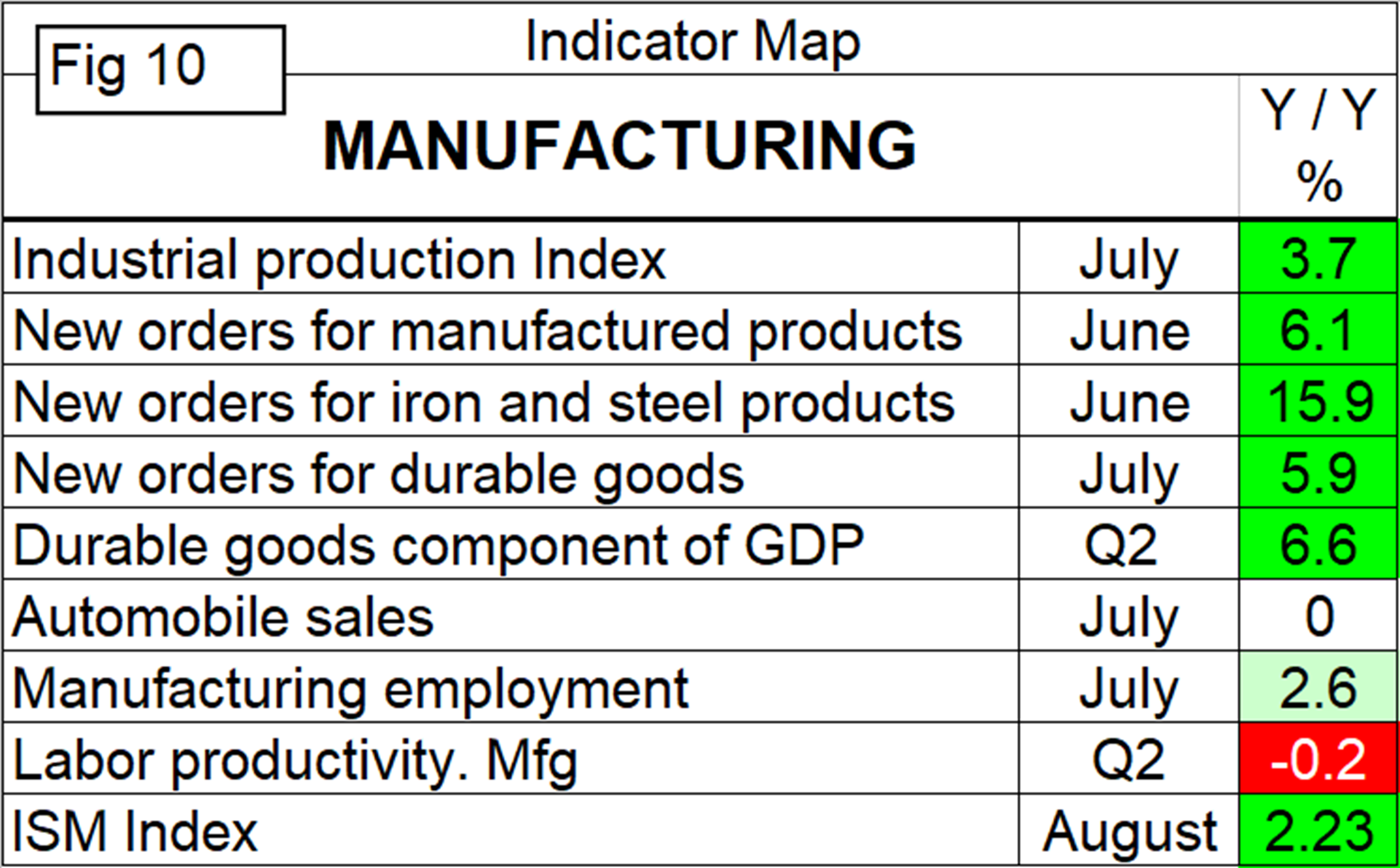 SMU Comment: Manufacturing activity is strong. Figure 10 shows a map of the nine indicators that we are currently tracking. The weakest of these is the performance of manufacturing labor productivity, which we find surprising considering all we read about AI and automation.