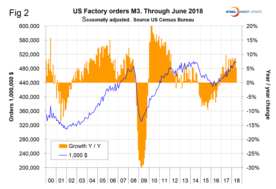 U.S. factory orders reported by the Census Bureau have been steadily increasing since mid-2016. In June, year-over-year growth was 5.4 percent.
