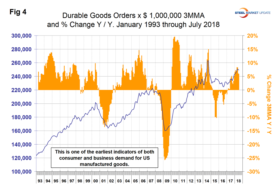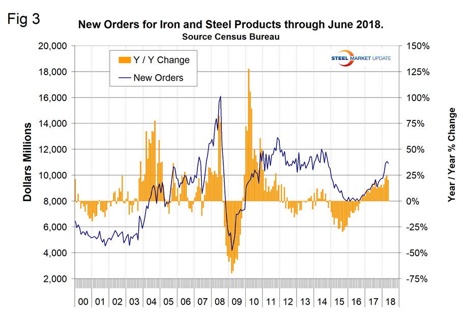 Within the Census Bureau M3 manufacturing survey is a subsection for new orders for Iron and Steel products. Figure 3 shows the history since January 2000 with an excellent growth rate of 15.9 percent year over year for June. Data at this level of detail is one month behind the advance report that covers total U.S. factory orders.