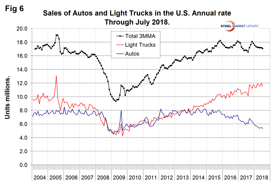 Our past reports have included auto assembly data for the U.S., Canada and Mexico, but that source has dried up, so until we find a replacement we are reporting on U.S. auto sales. Another complication is that effective April 2018, GM no longer reports their sales results. Automobile sales have trended down slightly in the last 2½ years and in July were exactly the same as in July last year at 16.8 million units annualized. Sales are still higher than the pre-recession level, but only just (Figure 6). Consumer preference for light trucks, which includes SUVs and crossovers, is still increasing. Import market share in July was 23.2 percent and has been drifting up since March last year.