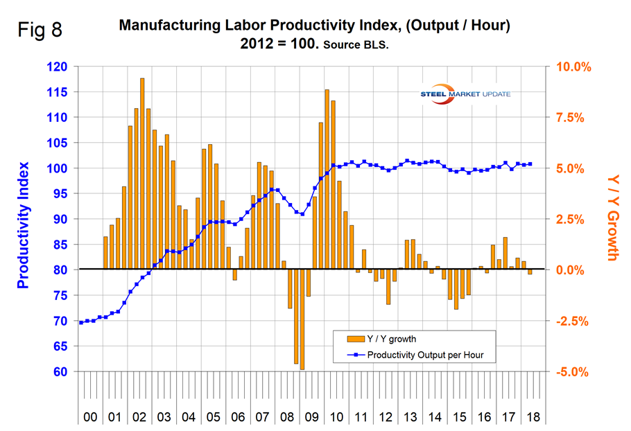 The Bureau of Labor Statistics reported that in Q2 2018 manufacturing productivity declined by 0.2 percent year over year (Figure 8). Since the third quarter of 2011, manufacturing productivity has had a net contraction of 0.6 percent, according to the BLS.