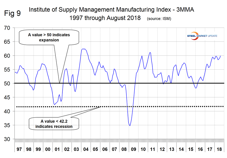 The Institute for Supply Management’s Manufacturing Index is a diffusion index. ISM states: “Diffusion indexes have the properties of leading indicators and are convenient summary measures showing the prevailing direction of change and the scope of change. An index value above 50 percent indicates that the manufacturing economy is generally expanding; below 50 percent indicates the opposite.” Figure 9 shows the 3MMA of the ISM index from January 1997 through August 2018 with an improving trend since January 2016. In August, the 3MMA of the index at 59.87 was the highest since April 2011.