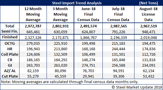 The U.S. Department of Commerce released Final Census Data today for July steel imports. The final number for July was 2,987,565 net tons. This is approximately 500,000 net tons more than June of this year. It was close to the 12-month moving average and slightly higher than the 3-month moving average (see table below).