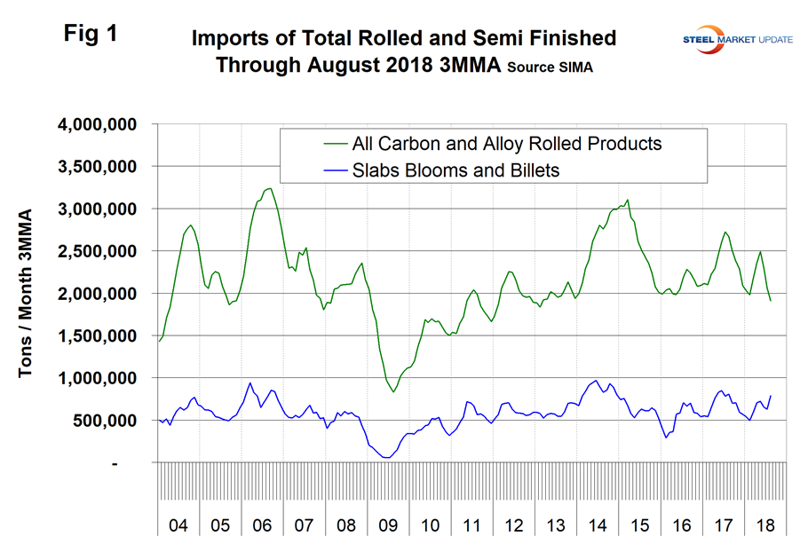 This early look at August’s import volume is based on license data (see explanation below). Figure 1 shows the tonnage of total rolled steel and semifinished imports through August on a three-month moving average (3MMA) basis. Clearly, it’s not so obvious what is going on, especially as far as rolled products are concerned.