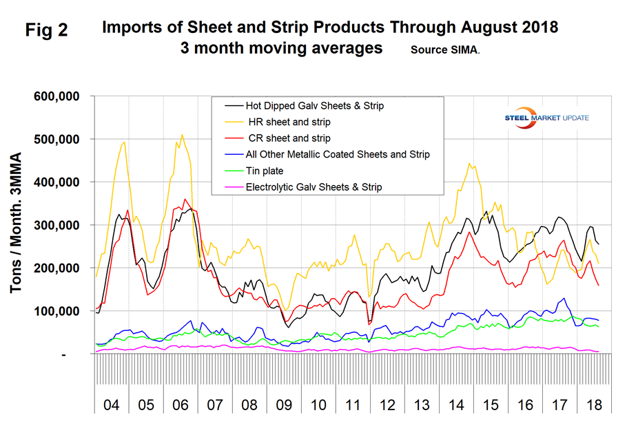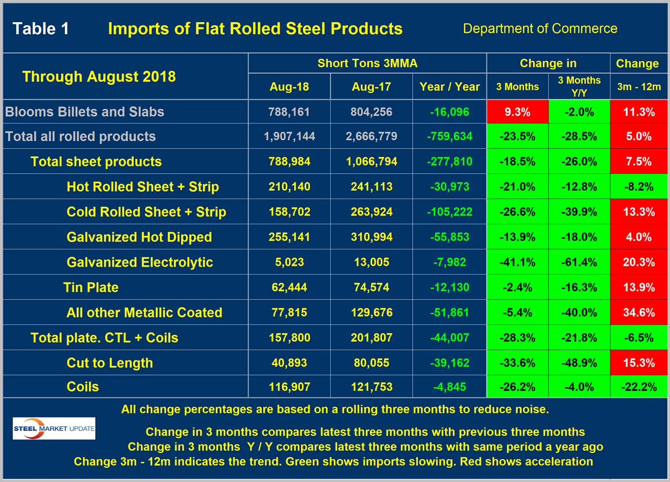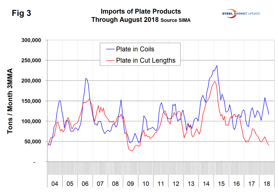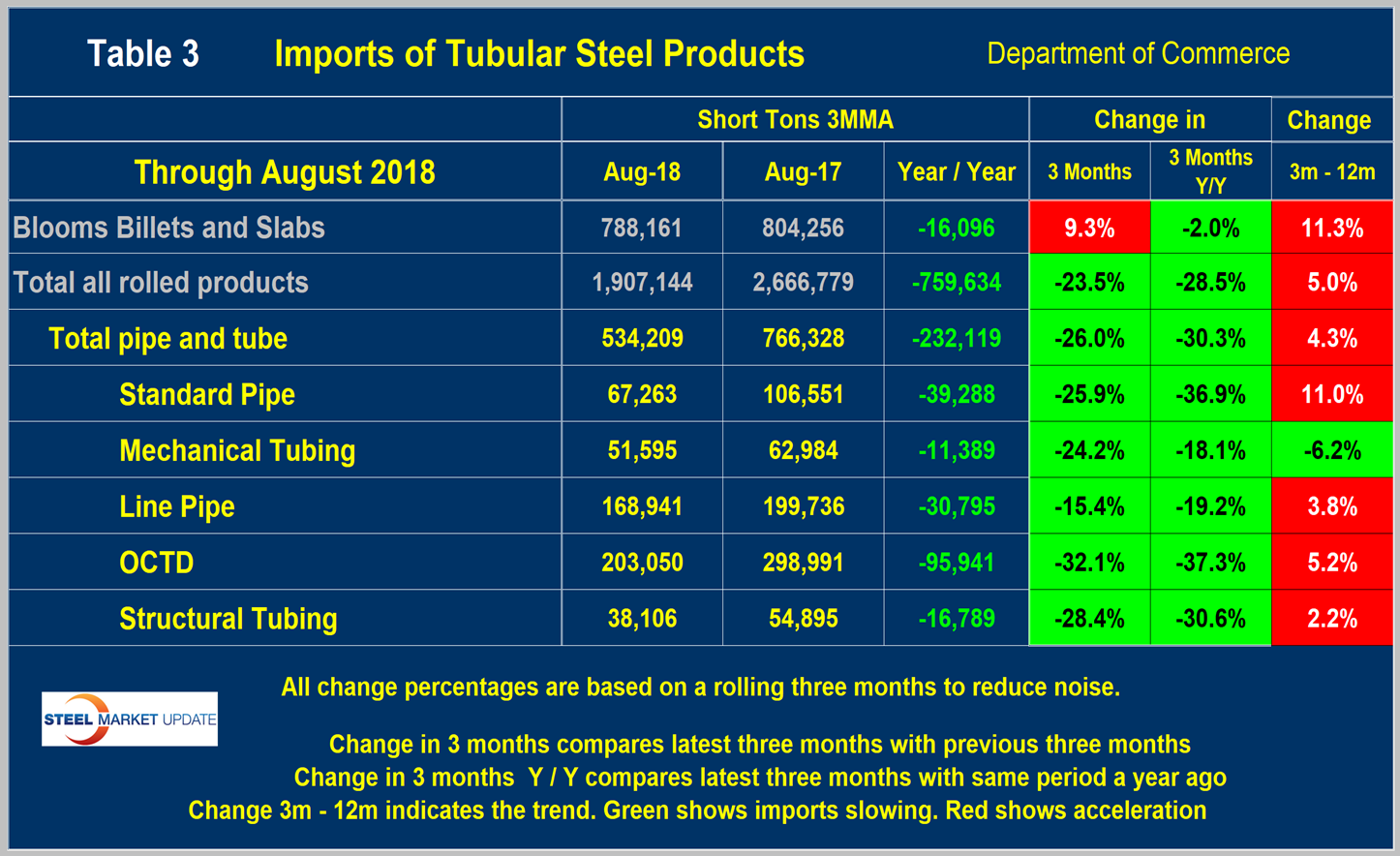 The situation regarding total rolled products is more complicated. Volume surged in 2014 and declined in 2015 to the extent that at the end of 2015 the volume was the same as at the beginning of 2014. For the purpose of our inquiry, we should ignore this period. Volume in 2017 peaked in June and the year ended down 1.3 percent from where it began. The decline continued through February 2018, surged again through May, then declined each month June through August. On a 3MMA basis, August was down by 23.5 percent from May. All four major product groups—sheet, longs, tubulars and plate—were down by over 18 percent on this basis, and all were down year over year. Therefore, it is true to say that rolled steel imports are down significantly in the last three months. In our opinion, it is still too soon to positively conclude that this was due to the tariffs. We need a few more months of data to reach that conclusion, but so far it looks that way.