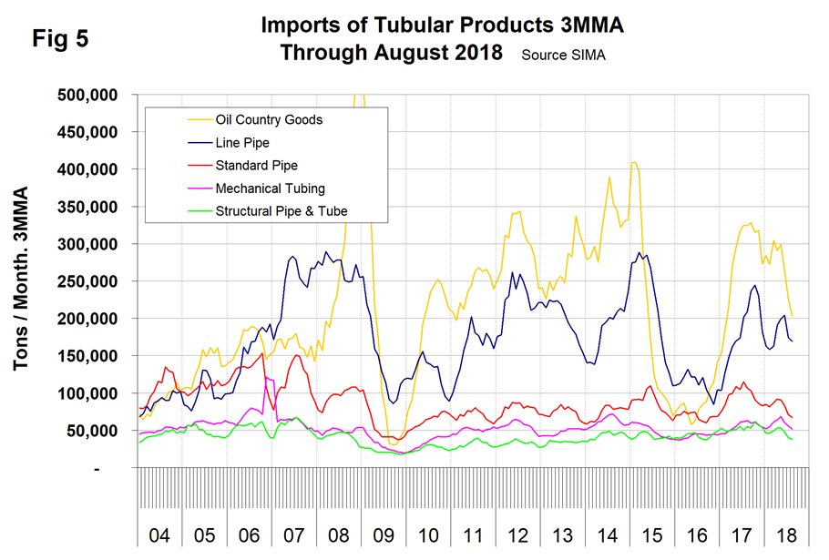 Table 3 shows that for tubular products the 3M/3M volume was down by 26.0 percent and the year-over-year volume was down by 30.3 percent. All individual products were down in both time frames. Figure 5 shows the history of tubular imports since 2004.