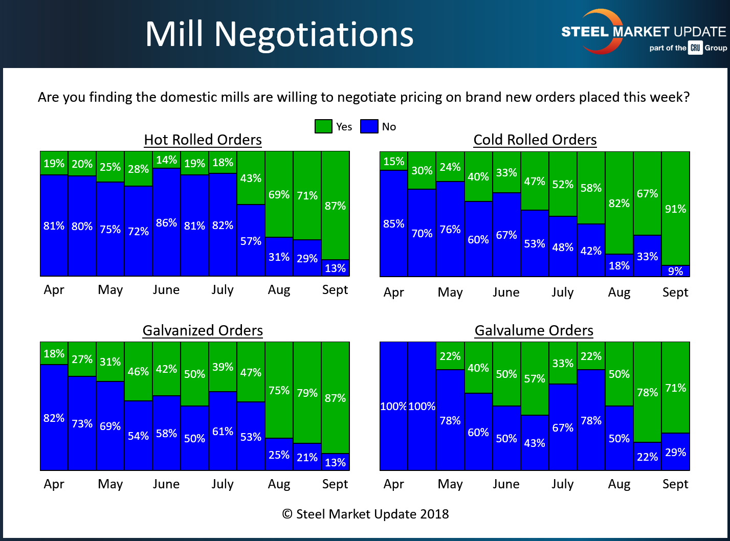 In the cold rolled segment, 91 percent said they have found mills willing to negotiate, up from 67 percent in mid-August. Only 9 percent of respondents reported current mill prices on cold rolled as non-negotiable.