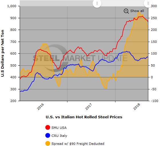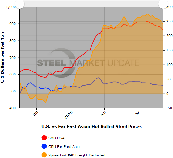 The following calculation is used by Steel Market Update to identify the theoretical spread between foreign hot rolled steel import prices (delivered to USA ports) and domestic hot rolled coil prices (FOB domestic mills). We want our readers to be aware that this is only a “theoretical” calculation as freight costs, trader margin and other costs can fluctuate, ultimately influencing the true market spread. We do not include the 25 percent tariff or any other unusual costs to the calculations we provide.