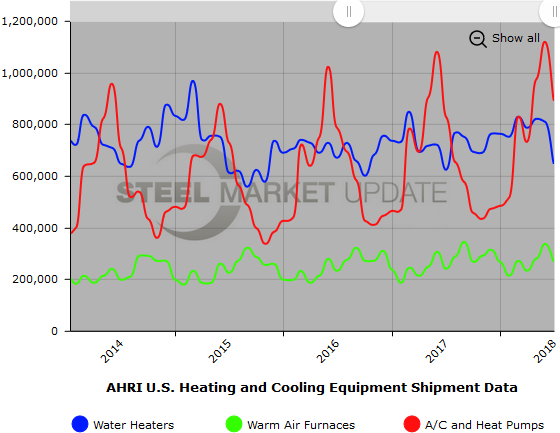 Below is a graph showing the history of total water heater, warm air furnace and air conditioner shipments. You will need to view the graph on our website to use it’s interactive features; you can do so by clicking here. If you need assistance with either logging in or navigating the website, contact info@SteelMarketUpdate.com.