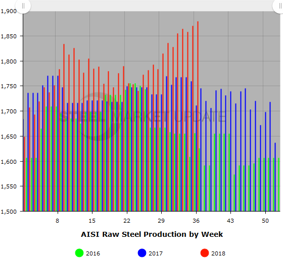 U.S. raw steel production finally topped the 80 percent capaciity utilization level the industry considers necessary for sustainable profitability. The American Iron and Steel Institute reported a utilization rate for the week ending Sept. 8 of 80.2 percent, up from 79.8 percent in the prior week, and up from 73.4 percent the same week one year ago. The last time the capability utilization rate was this high was the week ending Aug. 23, 2014, when 1,932,000 tons were produced at a rate of 80.3 percent.