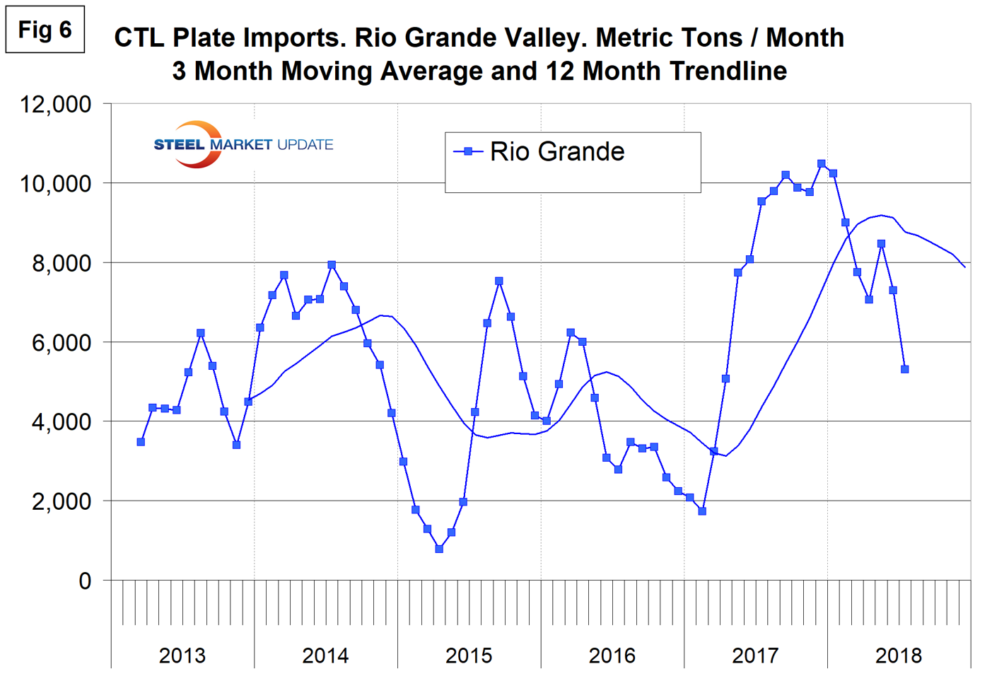 In the year to date through July 2018, 53.3 percent of all cut-to-length plate imports came in through the Great Lakes ports. The Gulf was in second place with 15.7 percent and the Rio Grande Valley third with 12.9 percent. The tonnage into the whole Pacific seaboard was minimal and even less into the Atlantic coast ports.