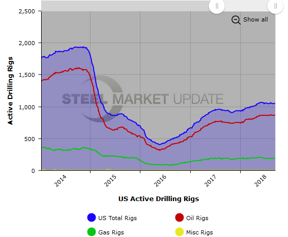 The U.S. active rig count, an indicator of oil country tubular goods demand, increased this week, according to oilfield services company Baker Hughes. The number of active U.S. rigs rose by 7 to 1,055, with oil rigs up 7 to 867 rigs, gas rigs unchanged at 186 rigs, and miscellaneous rigs unchanged at 2 rigs. Compared to this time last year, the 1,055 count is up 119 rigs, with oil rigs up 118, gas rigs unchanged, and miscellaneous rigs up 1. See the first graph below for a history of active U.S. rig counts.