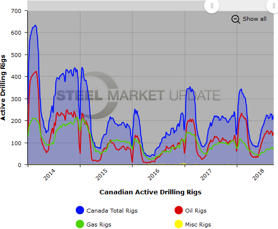 The Canadian rig count rose by 22 to 226 rigs, with oil rigs up 15 to 148 rigs, gas rigs up 7 to 78 rigs, and miscellaneous rigs unchanged at 0. Compared to last year, the 226 count is up 14 rigs, with oil rigs up 36, gas rigs down 22, and miscellaneous rigs unchanged. See the second graph below for a history of active Canadian rig counts.
