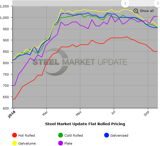 SMU Note: Below is a graphic showing our hot rolled, cold rolled, galvanized, Galvalume and plate price history. This data is available here on our website with our interactive pricing tool. Note that plate prices are not yet available on our website, but we are in the process of adding that dataset. If you need help navigating the website or need to know your login information, contact us at info@SteelMarketUpdate.com or 800-432-3475.