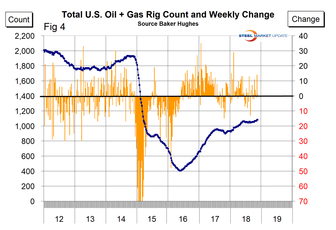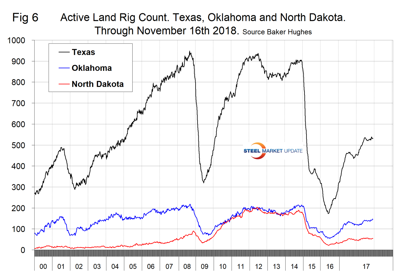 The spot price of West Texas Intermediate (WTI) FOB Cushing, Okla., had a recent peak on Oct. 3 of $76.40/barrel. By Nov.13, the price had declined to $55.63 and the rate was accelerating with a drop of $4.22 on the 13th. The total number of operating rigs exploring for oil and gas has only increased by 25 since June 15. The prices of oil and natural gas drive the consumption of energy-related steel products including oil country tubular goods, pipe fittings and well head equipment, among others. Welded tubular goods (not including OCTG) consumed about 5.5 million tons of hot rolled sheet in 2017.