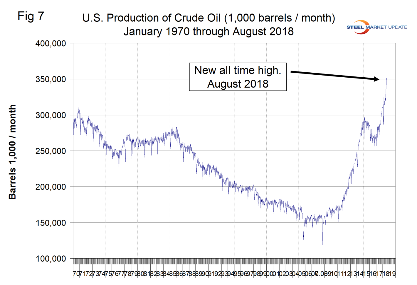 Figure 7 illustrates the monthly U.S. oilfield production of crude from January 1970 through August 2018 (latest data available) in thousands of barrels per month. The historical high was October 1970 at 310.4 million barrels. Production steadily declined to half that level in the late 2000s before the fracking revolution kicked in. December 2017 broke the record that had stood for 47 years with 310.7 million barrels produced, and August 2018 set a new record at 351.7 million barrels. EIA forecasts that U.S. crude oil production will average 10.7 million b/d in 2018, up from 9.4 million b/d in 2017, and will average 11.7 million b/d in 2019.