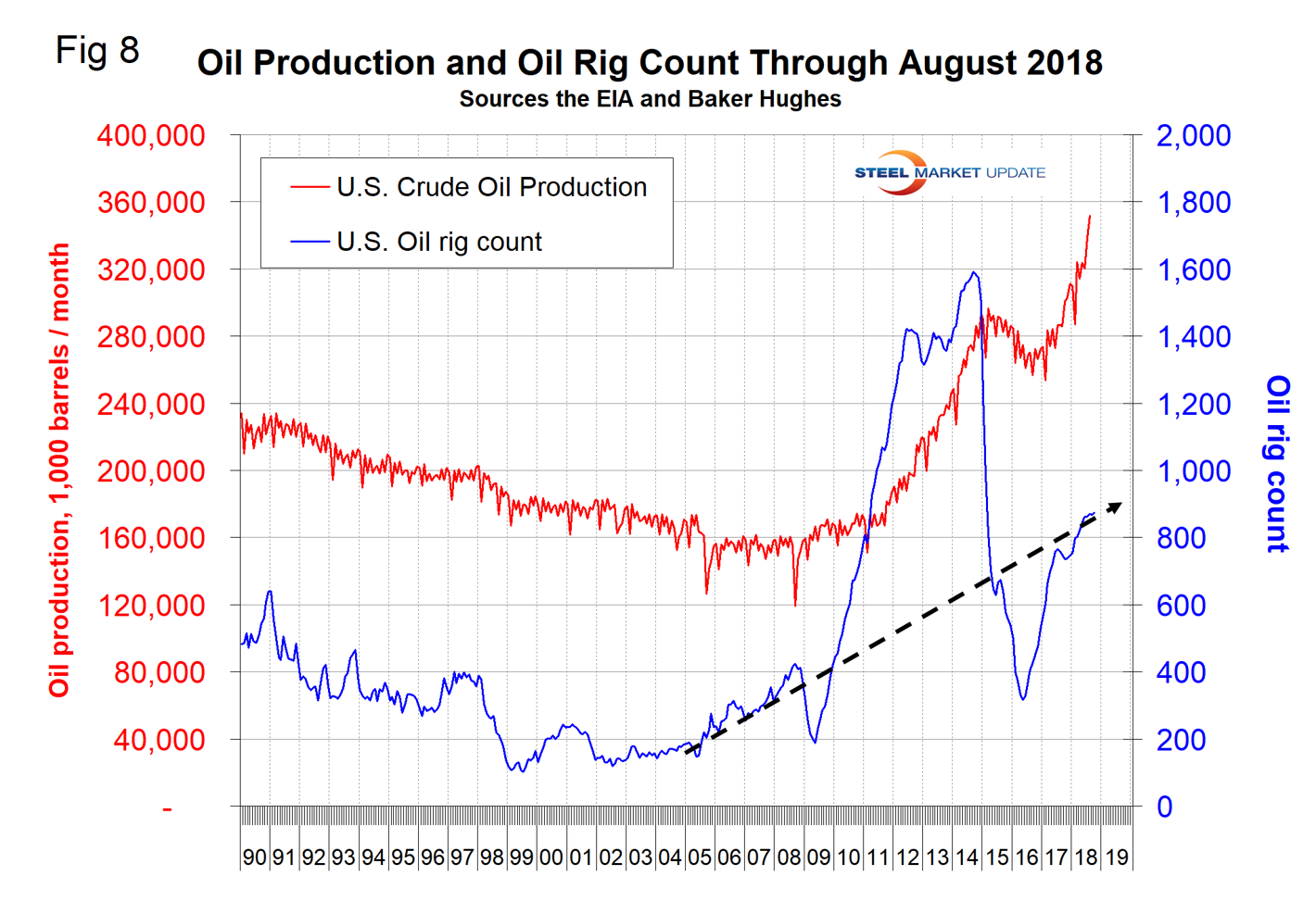 Figure 8 compares oil production and the oil rig count and shows how the increase in exploratory wells drove production from 2009 through late 2014 when the oil price collapsed. The subsequent decline in production was much less marked and is again setting new records. Our take on this is that the huge increase in exploratory oil rigs beginning in 2009 may have been an anomaly and that we won’t see a repeat of the number operating in 2014 for a very long time.