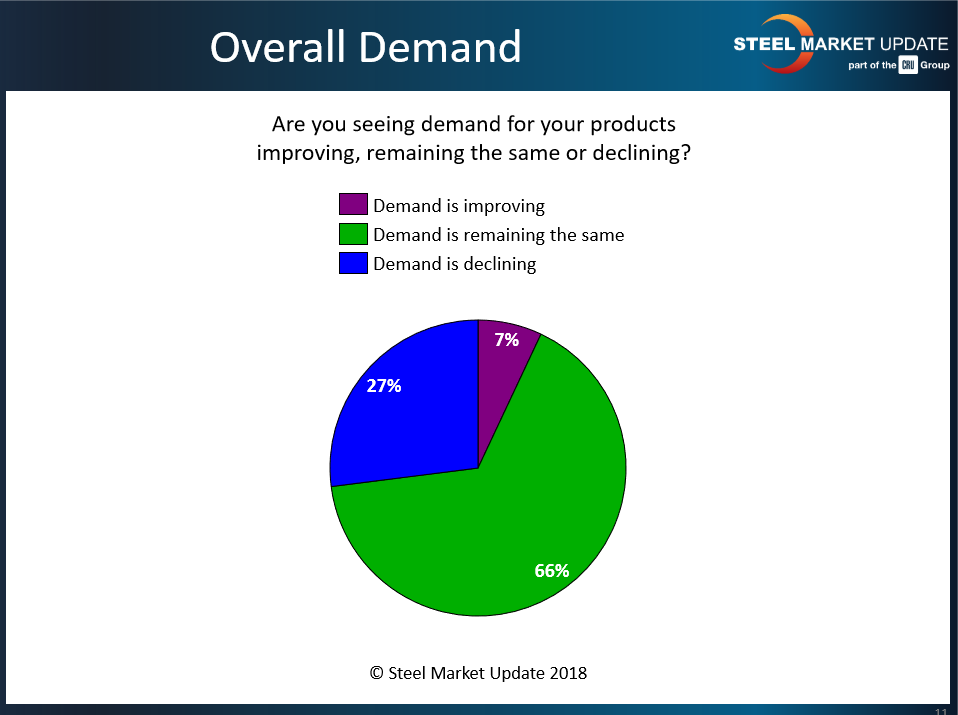 Steel demand appears to be softening. Last week’s Steel Market Update’s Flat Rolled Market Trends questionnaire shows that far more buyers see declining than improving demand. While two out of three respondents report that demand is remaining steady, a significant and growing percentage (27 percent) say demand is declining. Only 7 percent report improving steel demand.
