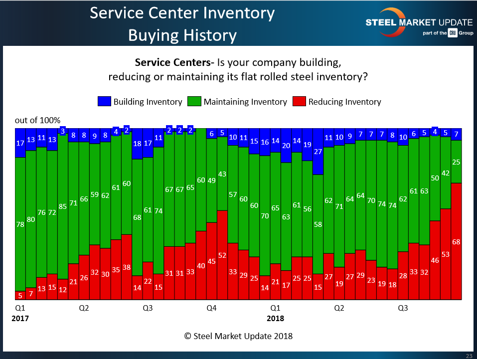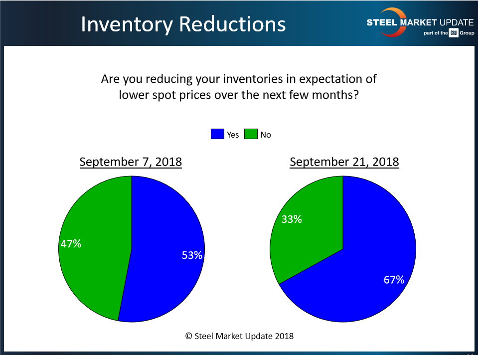 With steel prices on the decline, a growing number of service centers are working down their stock levels. Two out of three respondents to Steel Market Update’s flat rolled market trends questionnaire said they are reducing inventories in expectation of lower spot prices in the next few months.