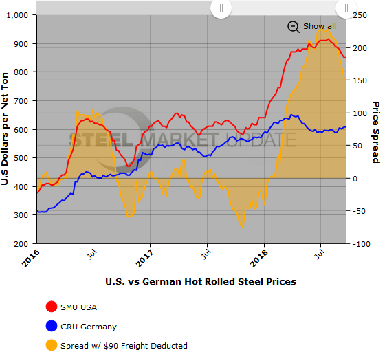As of Wed., Sept. 19, the CRU German HRC price was $608 per net ton, up $1 from the previous week and up $7 from two weeks prior. Adding $90 per ton for import costs, that puts the price at $698 per ton from Germany delivered to the U.S. The latest Steel Market Update hot rolled price average is $850 per ton for domestic steel, unchanged over last week and down $15 over two weeks ago. The spread between German and U.S. HR prices is now +$152 per ton, down from +$153 last week, and down from +$174 two weeks ago. That means domestic HR is now theoretically $152 per ton more expensive than importing HR steel from Germany. This is the eighth consecutive weekly decline, down $79 total. The four-week average price spread is now +$166 per ton, down $14 from last week.