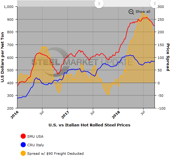 CRU published Italian HRC prices at $569 per net ton, up $1 over both last week and two weeks ago. After adding import costs, we get a delivered price of approximately $659 per ton. The spread between the Italy and U.S. figure is +$191 per ton, down from +$192 one week ago and +$207 two weeks ago. Meaning that U.S. HR is theoretically $191 per ton more expensive than importing steel from Italy. Like the German spread, this is the eighth consecutive weekly decline in the Italian price spread, down $75 total. The four-week average is now +$202, down $10 over last week.