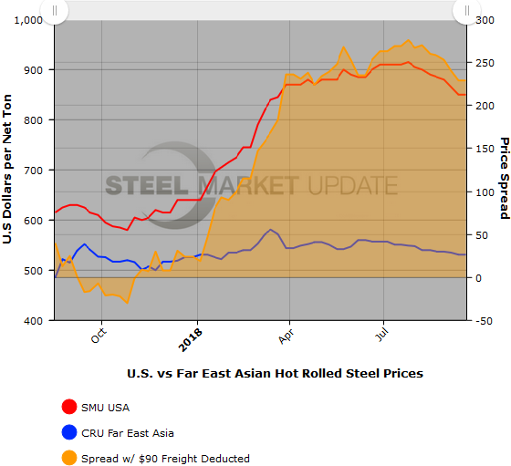 The following calculation is used by Steel Market Update to identify the theoretical spread between foreign hot rolled steel import prices (delivered to USA ports) and domestic hot rolled coil prices (FOB domestic mills). We want our readers to be aware that this is only a “theoretical” calculation as freight costs, trader margin and other costs can fluctuate, ultimately influencing the true market spread. We do not include the 25 percent tariff or any other unusual costs to the calculations we provide.