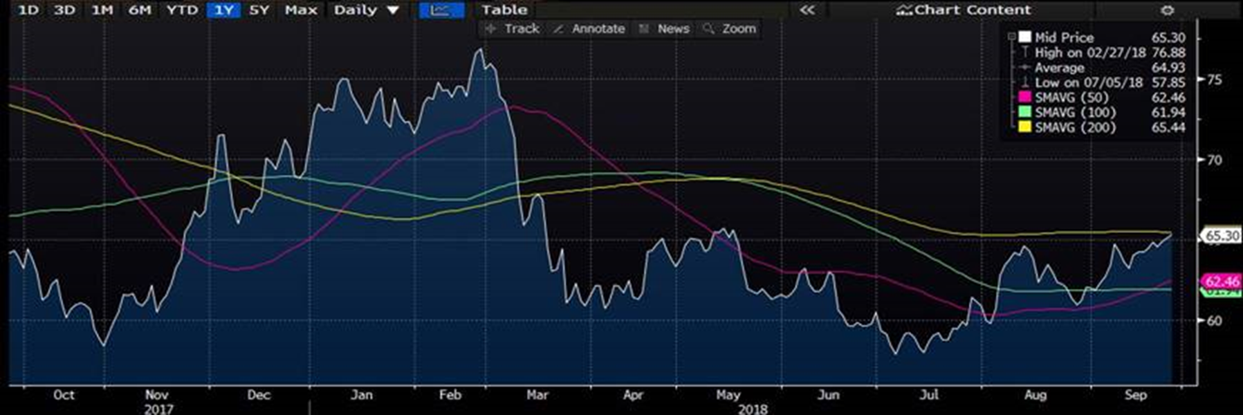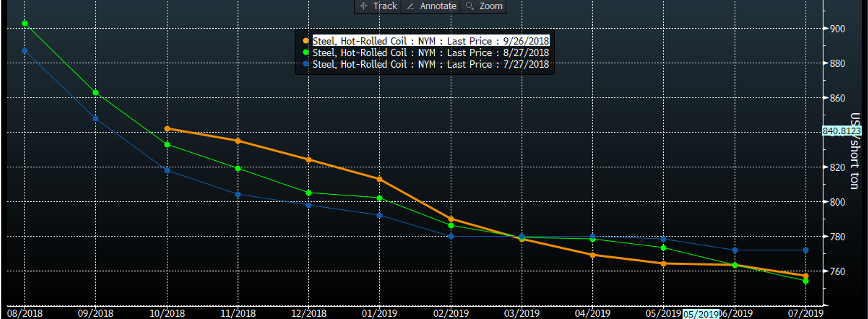 The Hot Rolled Steel price indices have moved lower in the past few weeks. The lower trending index in the past weeks has not seen the HRC futures market react wildly. To a great extent, the futures were already pricing-in the decline in physical steel transaction prices. Month over month, the nearby month is a touch higher (the orange line vs. the green line). Interestingly, the back end of the curve (Mar ’19 onwards) has seen the contracts on those months trade lower. One possible explanation of this may be the market participants either getting more bearish on the market longer term, or spreaders betting that the spread between Q4 and months in Cal 19 will expand further.