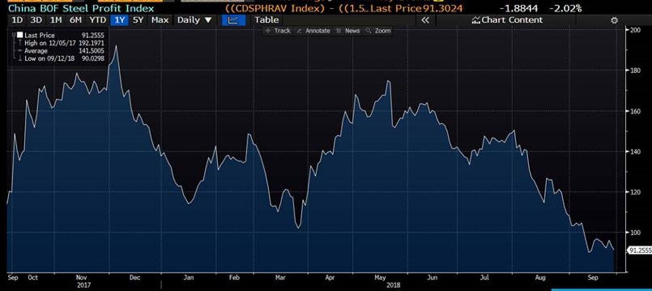 The Chinese mills, having seen margins (white line below) come under pressure in the past few days due to the stubbornness of ore will likely see more pain as rebar retreats. The key to watch out for U.S.-based businesses is how, if at all, Chinese market movements end up impacting demand for steel products in China. A weaker domestic market in China may incentivize exports and lower global prices, which may further widen the gap between U.S. and global steel prices.
