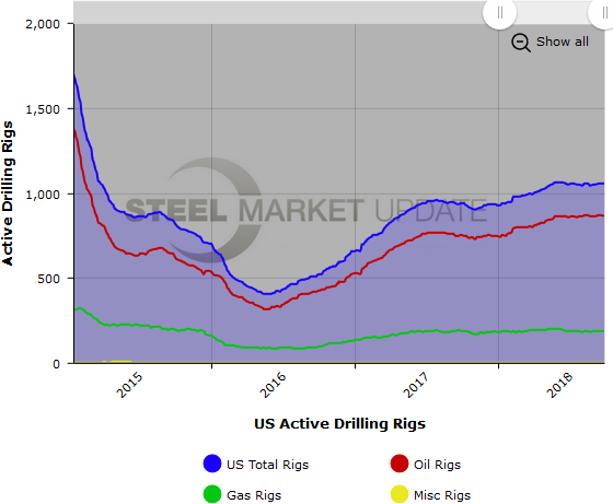 The U.S. active rig count, an indicator of oil country tubular goods demand, increased this week, according to oilfield services company Baker Hughes. The number of active U.S. rigs rose by 1 to 1,054, with oil rigs down 3 to 863 rigs, gas rigs up 3 to 189 rigs, and miscellaneous rigs up 1 to 2 rigs. Compared to this time last year, the 1,054 count is up 114 rigs, with oil rigs up 113, gas rigs unchanged, and miscellaneous rigs up 1. See the first graph below for a history of active U.S. rig counts.